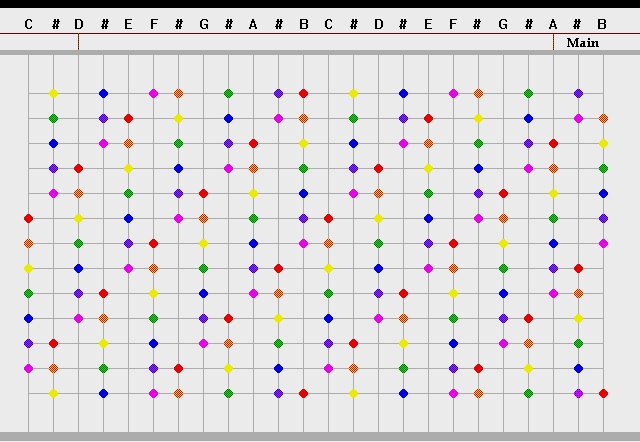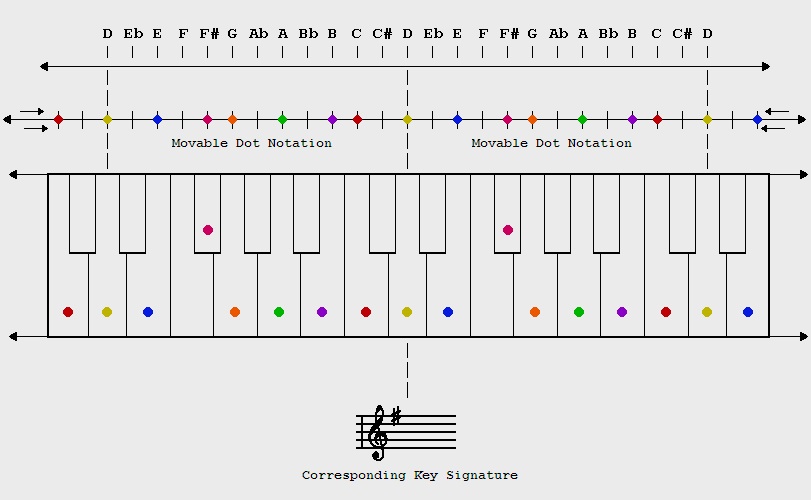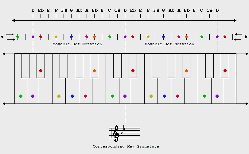 Comparing the above and below figures, we can observe how the Dot-Notation of the PrimaryDiatonic Scale, or any of its modes, stays the same in form even when the key-signature has changed and the notes of the keyboard obtain new colors. The Major Scale is always found at Main Orange [MO]; the Natural Minor Scale is always found at Main Blue [MB]. |