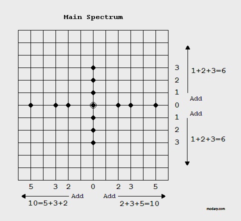 Upon recognition of the multitude of spectrums, it became necessary for the research to determine a precise quantity of potential spectrums and modes. Using a simple computer programming language, we were able to request that a computer find all of the possible scales that match a small set of regiments regarding modal-scales; more specifically, since each mode of any spectrum naturally has six others that live with it as relatives, we were looking for the modes that had the quality of being in the center of their spectrum; these incidentally coincide with a principle of fulcrum mechanics. |