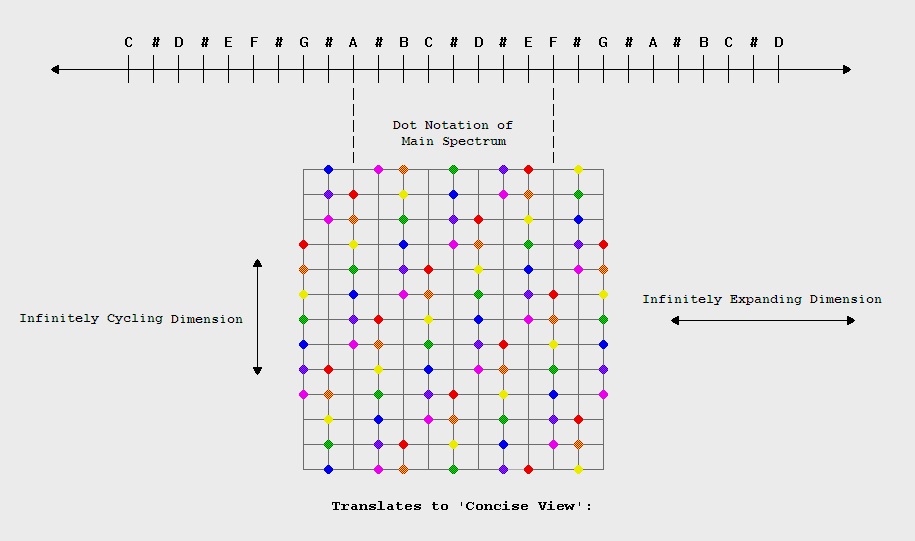 Since each of the spectrums consist of two dimensions, each of them containing forms that infinitley recycle every 12 intervals, it is possible to fully represent each spectrum within a concise 12 x 12 grid. |