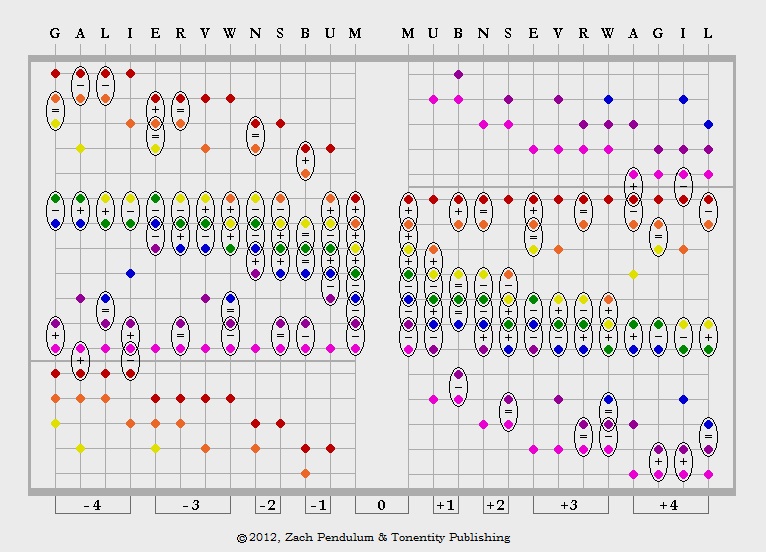 During the first of the two decades involving this research, a great deal of consideration had to be given to the possibility of physically adjoining the modes to one another in a specific way which would lead to an understanding of the workings of modulation. When looking at the vertical dimension of each of the spectrums side-by-side, as shown below, we can see physical evidence of an underlying harmonization; then auditory perception of these harmonies concurred that the spectrums should be aligned in this manner. This graph is called the 'Cross Section' and is presented here with four spectrums omitted. |